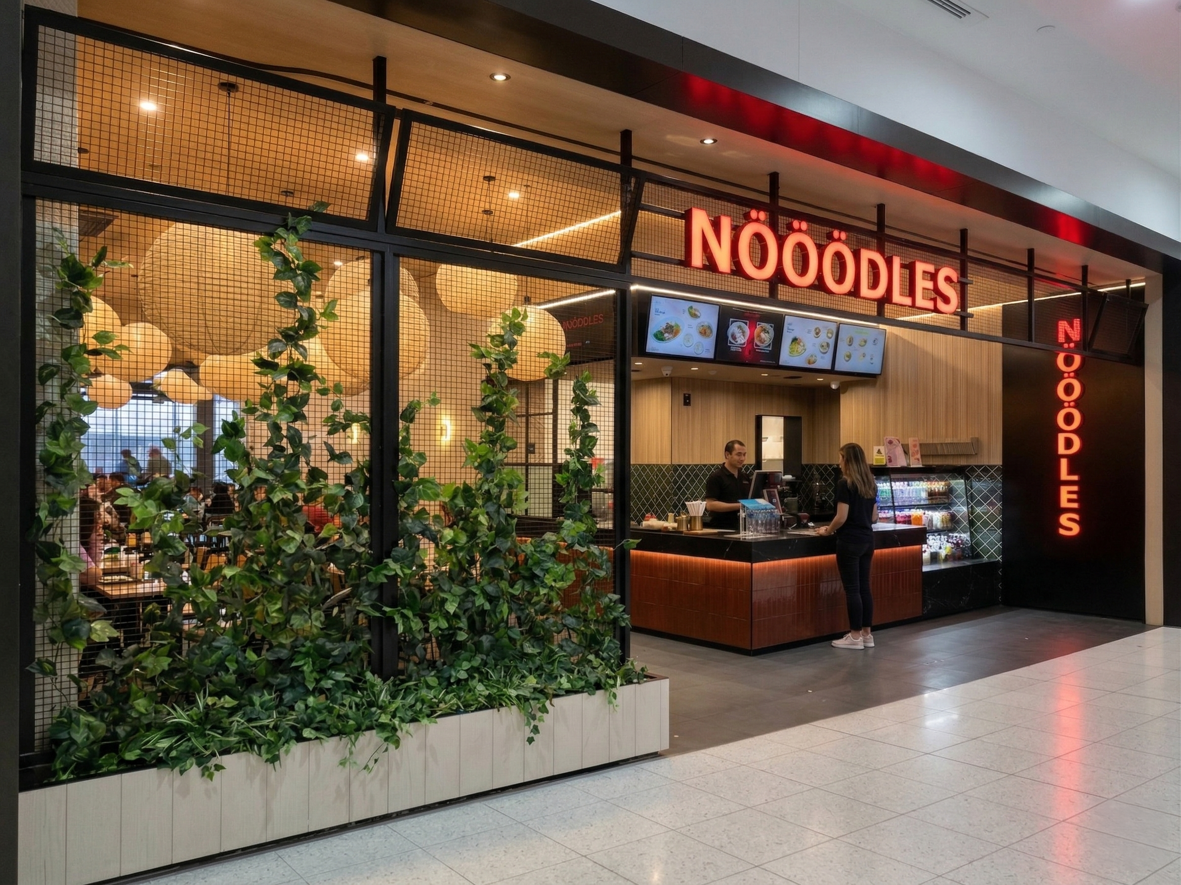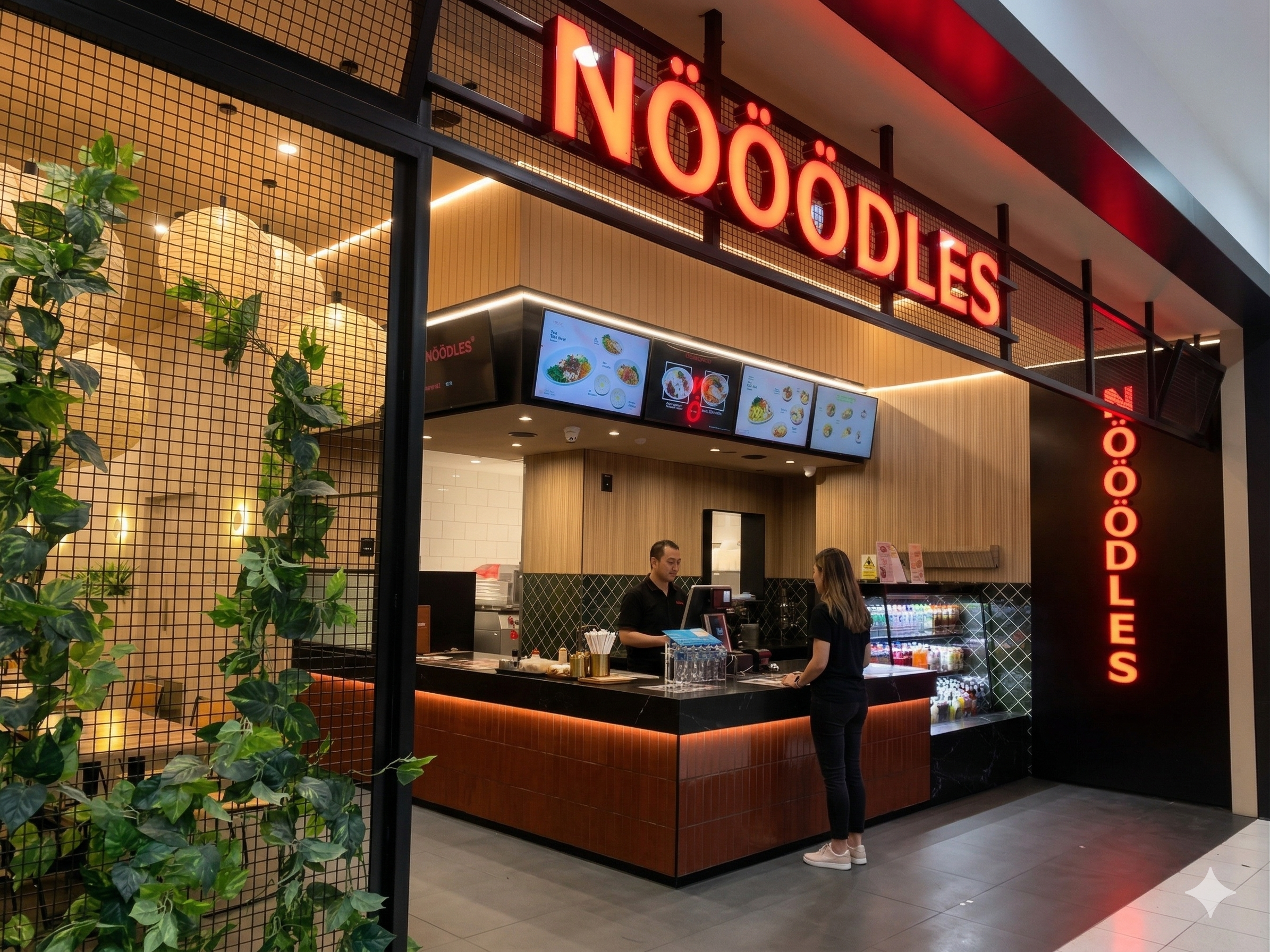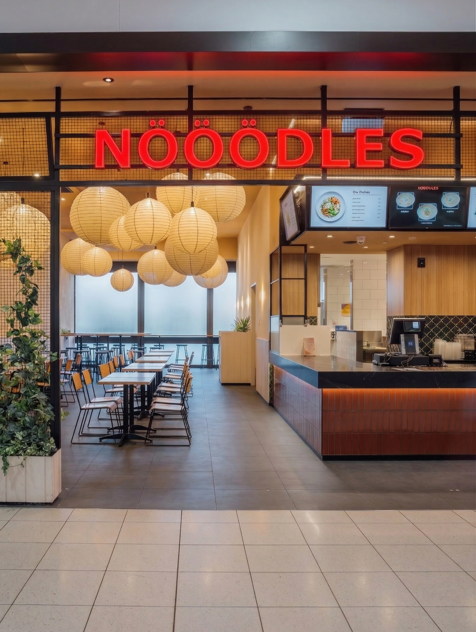 The service counter pairs warm timber with clean, contemporary lines, while the bold illuminated signage anchors the brand presence from afar. A mix of communal tables, counter seating and two-tops provides flexibility for solo travellers and groups.