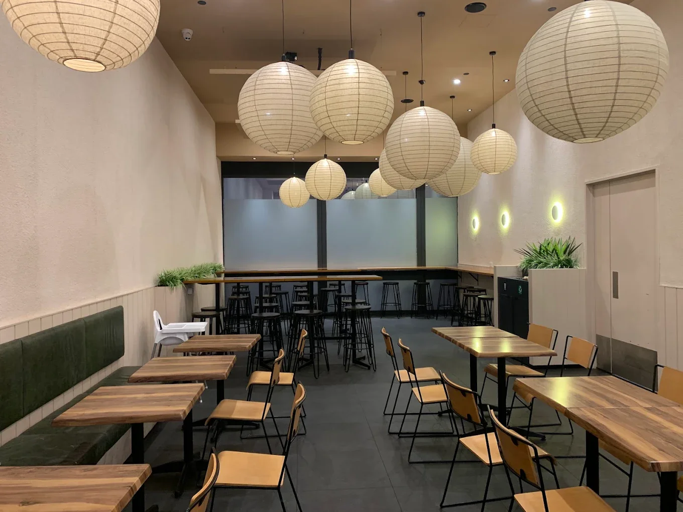 This café is designed as a warm, modern retreat within a fast-paced airport environment. A calm, minimal palette of natural timber, soft greys and warm lighting creates a relaxed dining atmosphere for travellers. Oversized paper lanterns form a floating sculptural feature above the seating area, bringing softness and visual impact to the space.